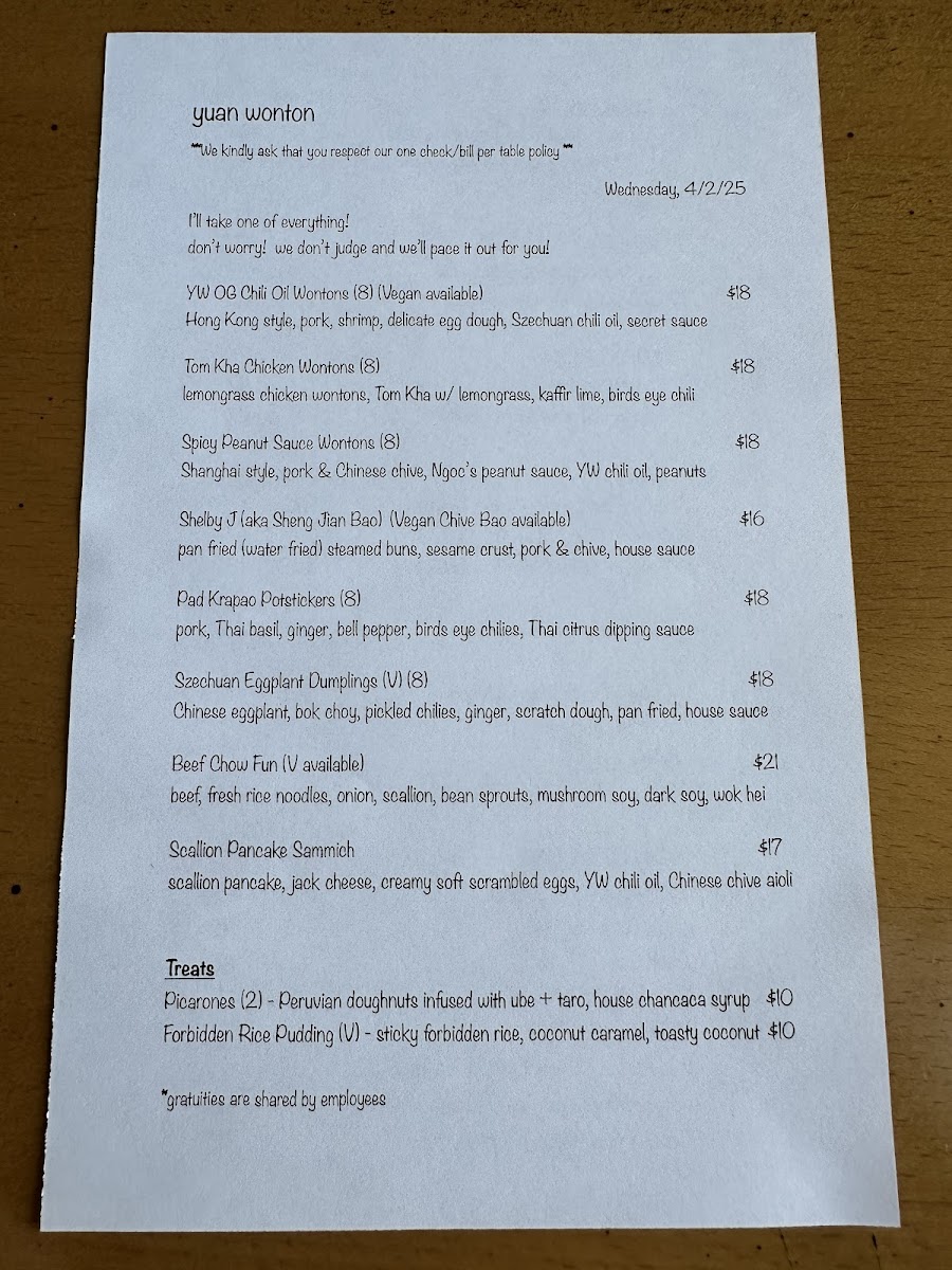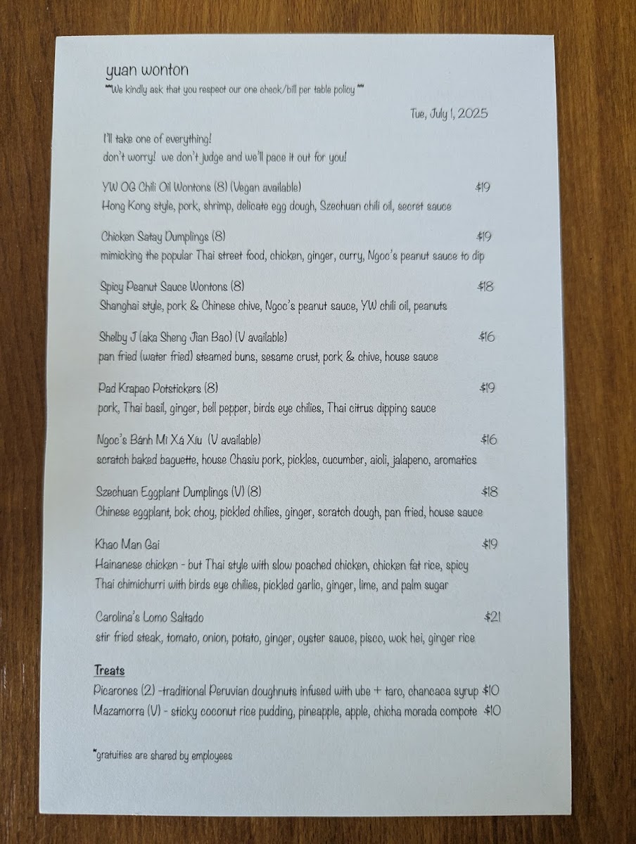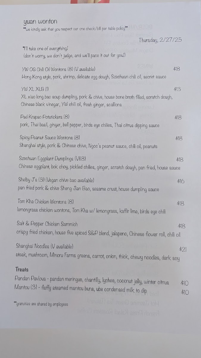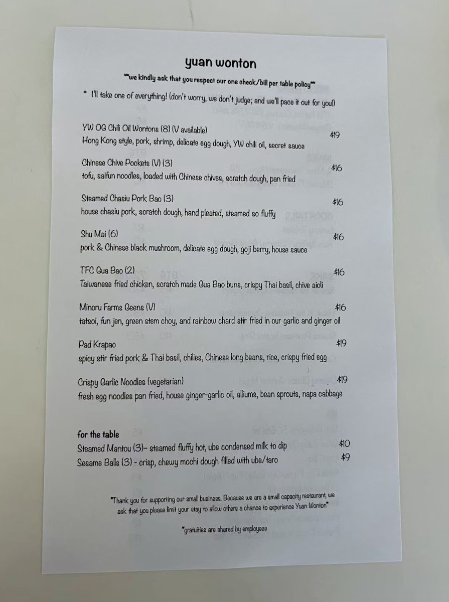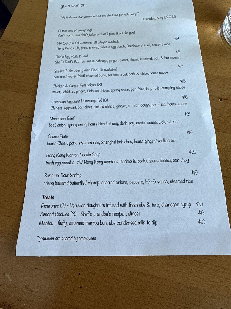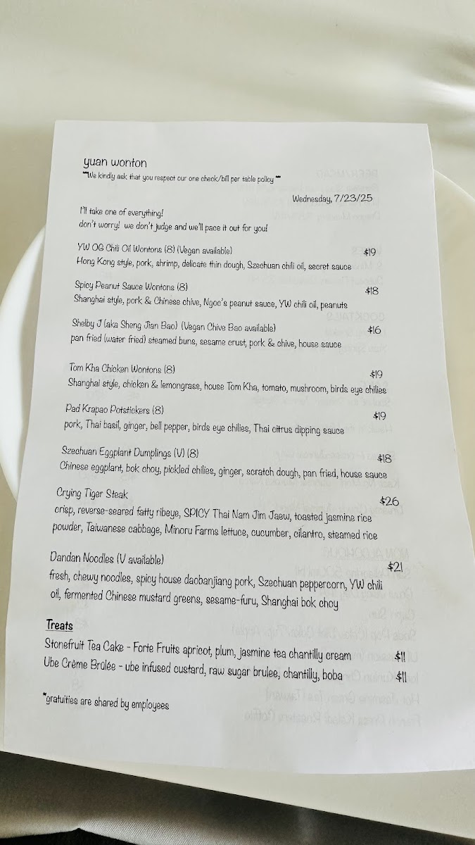 If you're craving delicious and comforting wontons, the Yuan Wonton Menu has just what you need. Nestled in Denver, CO, Yuan Wonton offers a variety of expertly crafted dishes that highlight the flavors of traditional Chinese cuisine. From rich, savory broths to the perfect balance of flavors in each wonton, every bite is a treat. Their menu features a variety of options that cater to all tastes, whether you're looking for something light and refreshing or a more hearty meal. With each dish made to order, the menu at Yuan Wonton ensures a fresh and satisfying experience that you’ll keep coming back for. Enjoy a meal that feels like a warm embrace, served with attention to every detail.
